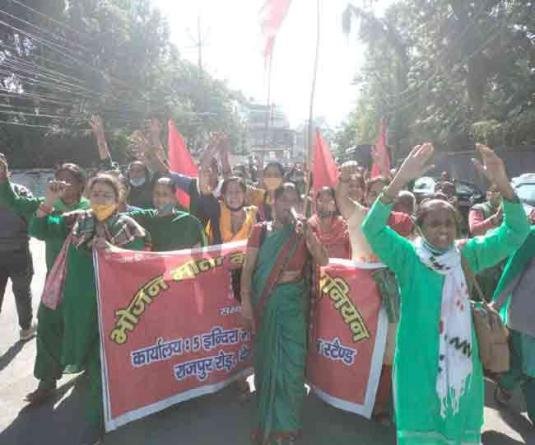 MY BHARAT TIMES, 27 अक्टूबर 2021, देहरादून। सीटू से संबंद्ध उत्तराखंड भोजन माता कामगार यूनियन ने पांच हजार मानदेय का शाशनादेश जारी करने की मांग को लेकर सचिवालय कूच किया। इस दौरान पुलिस ने उन्हें सुभाष रोड पर बैरिकेड लगाकर रोक दिया। जिस पर वे वहीं धरने पर बैठ गईं। भोजन माताओं ने सरकार के खिलाफ जमकर नारेबाजी की और चेतावनी दी कि जब तक मांग पूरी नहीं होगी वह धरना समाप्त नहीं करेंगी।