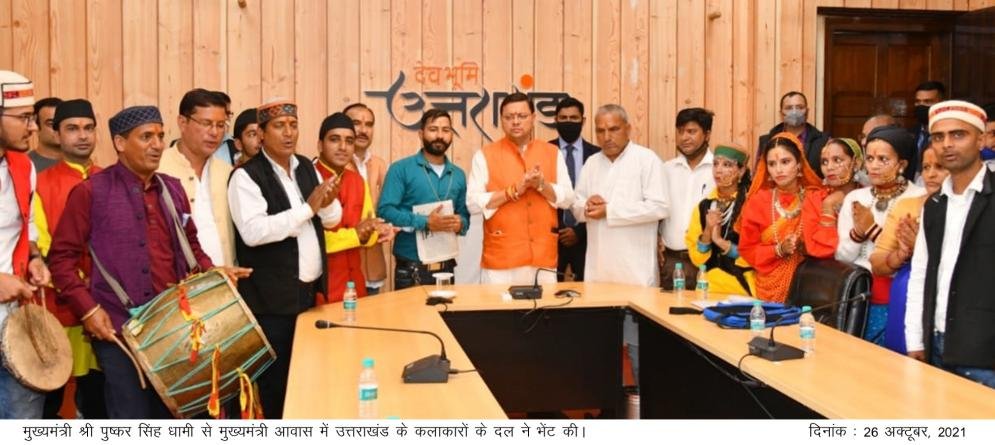 MY BHARAT TIMES, 26 अक्टूबर 2021, देहरादून (सू.वि.)। मुख्यमंत्री पुष्कर सिंह धामी से मंगलवार को मुख्यमंत्री आवास में उत्तराखंड के कलाकारों के दल ने भेंट की। इस अवसर पर उत्तराखंड में लोक कला एवं लोक संस्कृति को बढ़ावा देने पर बातचीत हुई। मुख्यमंत्री ने कहा की लोक परम्परा को आगे बढ़ाने में कलाकारों की महत्वपूर्ण भूमिका होती है। किसी भी क्षेत्र की पहचान में वहां की लोक संस्कृति, बोली एवं लोक परम्परा का अहम योगदान होता है। जन चेतना से संबंधित विभिन्न पहलुओं पर जागरूकता में हमारे कलाकार महत्वपूर्ण भूमिका निभाते हैं।