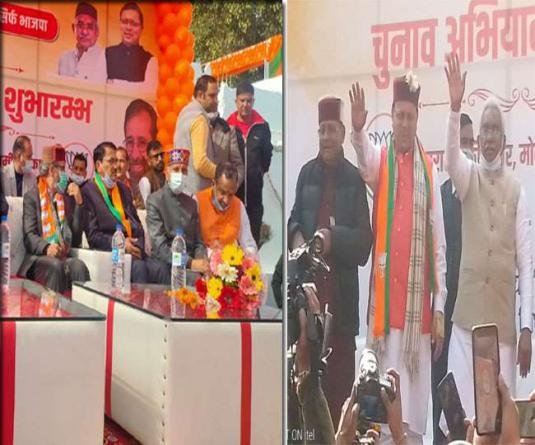 MY BHARAT TIMES, 01 फरवरी 2022, देहरादून। उत्तराखंड विधानसभा चुनाव के लिए सभी 70 विधानसभा क्षेत्रों में भाजपा का चुनाव महाअभियान शुरू हो गया है। इसके लिए हिमाचल के मुख्यमंत्री जयराम ठाकुर और ऊर्जा मंत्री सुखराम विकासनगर पहुंचे। वे विकासनगर विधानसभा सीट से गढ़वाल मंडल के लिए भाजपा के प्रचार अभियान की शुरुआत करने जा रहे हैं। वे इस सीट से भाजपा प्रत्याशी मुन्ना सिंह चौहान के समर्थन में जनता के बीच पहुंचेंगे। इसके बाद वह सहसपुर विधानसभा क्षेत्र में पार्टी प्रत्याशी के समर्थन में घर-घर जनसंपर्क करेंगे। वहीं, दूसरी ओर सीएम पुष्कर सिंह धामी भाजपा प्रत्याशी खजान दास के लिए प्रचार किया।