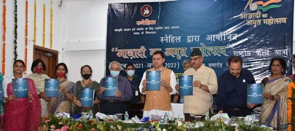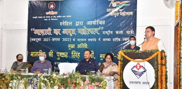 MY BHARAT TIMES, 12 अक्टूबर 2021, देहरादून (सू.वि.)। मुख्यमंत्री श्री पुष्कर सिंह धामी ने मंगलवार को मुख्यमंत्री आवास स्थित जनता दर्शन हॉल में स्नेहिल संस्था द्वारा आयोजित आजादी का अमृत महोत्सव राष्ट्रीय कला यात्रा के उद्घाटन समारोह में मुख्य अतिथि के रूप में प्रतिभाग किया। इस अवसर पर मुख्यमंत्री ने स्नेहिल स्मारिका का विमोचन भी किया गया। मुख्यमंत्री श्री पुष्कर सिंह धामी ने कहा कि आजादी के अमृत महोत्सव के तहत स्नेहिल संस्था द्वारा शहीदों एवं क्रांतिकारियों का कला एवं साहित्यिक गतिविधियों द्वारा स्मरण किया जा रहा है, यह एक सराहनीय प्रयास है। मुख्यमंत्री ने कहा कि कला, साहित्य एवं संस्कृति मानव जीवन के अभिन्न अंग हैं। हमारे क्रान्तिकारियों, बलिदानियों एवं देश की आजादी के लिए महत्वपूर्ण योगदान देने वालों की याद में देशभर में आजादी का अमृत महोत्सव धूमधाम से मनाया जा रहा है। उन्होंने कहा कि देश के इन सपूतों के कृत्यों और गाथाओं की जानकारी युवा पीढ़ी को होना जरूरी है।