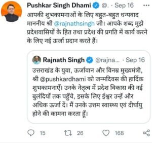 गृह मंत्री अमित शाह ने लिखा है कि ‘देवभूमि के कल्याण के प्रति आपकी निष्ठा और समर्पण ने प्रदेश के विकास को नई गति दी है। देश के रक्षा मंत्री राजनाथ सिंह ने शुभकामनाएं देते हुए कहा है कि ‘धामी जी के नेतृत्व में प्रदेश विकास की नई बुलंदियों तक पहुंचे, इसके लिए ईश्वर उन्हें और अधिक ऊर्जा दें’। इन सभी ने मुख्यमंत्री धामी के विनम्र, लगनशील और समर्पण भाव वाले गुणों की खुलकर तारीफ की है और उनके राजकाज को जमकर सराहा है। देश और दुनियाभर से भी धामी के शुभचिंतकों ने उनको बड़ी संख्या में शुभकामना संदेश भेजे हैं।