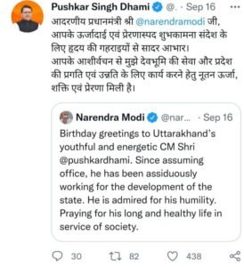 मुख्यमंत्री पुष्कर सिंह धामी को जन्मदिन का बधाई संदेश भेजने वालों में प्रधामनंत्री नरेन्द्र मोदी, गृह मंत्री अमित शाह और रक्षा मंत्री राजनाथ सिंह शामिल हैं। प्रधानमंत्री नरेन्द्र मोदी ने ट्वीट के जरिए भेजे गए अपने बधाई संदेश में कहा है कि ‘उत्तराखण्ड के युवा और ऊर्जावान मुख्यमंत्री पुष्कर सिंह धामी को जन्मदिन की शुभकामनाएं। पदभार ग्रहण करने के बाद से वह राज्य के विकास के लिए लगन से काम कर रहे हैं। वह अपनी विनम्रता के लिए प्रशंसनीय हैं। मैं समाज की सेवा के लिए उनके लंबे और स्वस्थ जीवन की प्रार्थना करता हूं’। संदेश से साफ है कि प्रधानमंत्री ने जिम्मेदारी के प्रति धामी के समर्पण और लगनशीलता की सराहना की है। इसी तरह का बधाई संदेश देश के गृह मंत्री अमित शाह ने भी भेजा है।