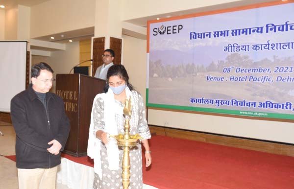 MY BHARAT TIMES, 09 दिसंबर 2021, देहरादून (सू.वि.)। मंगलवार को देहरादून के एक स्थानीय होटल में कार्यालय मुख्य निर्वाचन अधिकारी, उत्तराखण्ड एवं सूचना विभाग के संयुक्त तत्वाधान में एक दिवसीय मीडिया कार्यशाला का आयोजन किया गया। कार्यशाला का शुभारम्भ मुख्य अतिथि मुख्य निर्वाचन अधिकारी श्रीमती सौजन्या, महानिदेशक सूचना रणबीर सिंह चौहान एवं मुख्य वक्ता प्रो.डॉ. सुभाष गुप्ता द्वारा दीप प्रज्ज्वलित कर किया गया है।