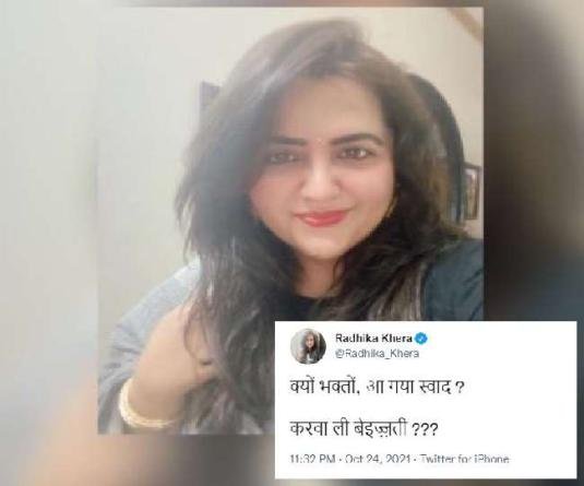 MY BHARAT TIMES, नई दिल्ली। टी-20 विश्वकप मुकाबले में पाकिस्तान के हाथों भारत की हार के बाद पूरे देश में लोगों में गुस्सा है। सोशल मीडिया पर हर तरफ लोग भारत की इस हार पर प्रतिक्रियाएं दे रहे हैं और अपना गुस्सा जाहिर कर रहे हैं। लेकिन इस बीच, टी-20 वर्ल्डकप में पाकिस्तान से भारत की हार के बाद कांग्रेस नेता का एक ट्वीट चर्चा में आ गया। लेकिन उनके ट्वीट को लेकर यूजर्स ने उन्हें ट्रोल कर दिया। दरअसल, कांग्रेस की सोशल मीडिया कोऑर्डिनेटर राधिका खेड़ा ने पाकिस्तान के हाथों भारत की हार के बाद ट्वीट किया। जिस पर वो ट्रोल हो गईं। कांग्रेस की नेता राधिका खेड़ा ने भारत की हार पर ट्वीट कर लिखा- ”क्यों भक्तों, आ गया स्वाद? करवा ली बेइज्जती?”